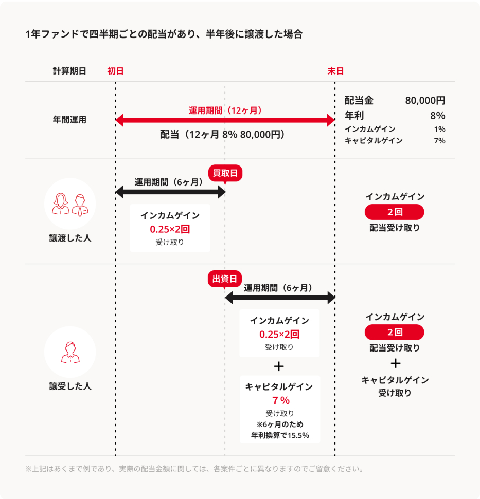 ヤマワケリセールは既に運用が開始されているファンドですので、出資持分を取得する(地位譲渡を受ける)投資家様は、運用期間(計算期間)の途中からファンドに参加することになるため、実際の投資日数は当初から投資している投資家より短くなります。このため、実際に投資している期間の年利換算の想定利回りでは高くなります。
