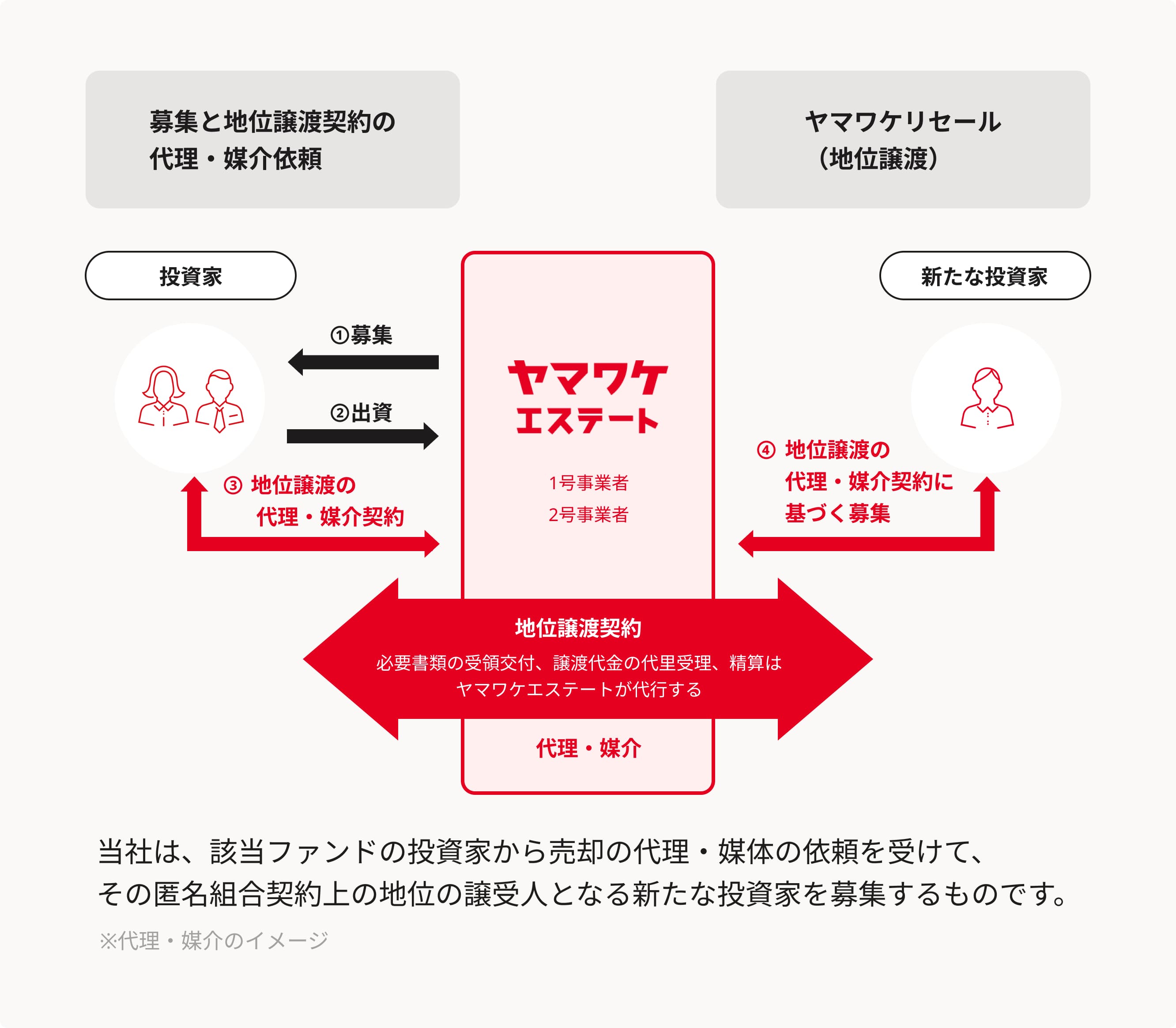 「ヤマワケリセール」は、当社の不動産特定共同事業の各ファンド成立後その出資分の譲渡手続き(代理・媒介手続き)の愛称です。